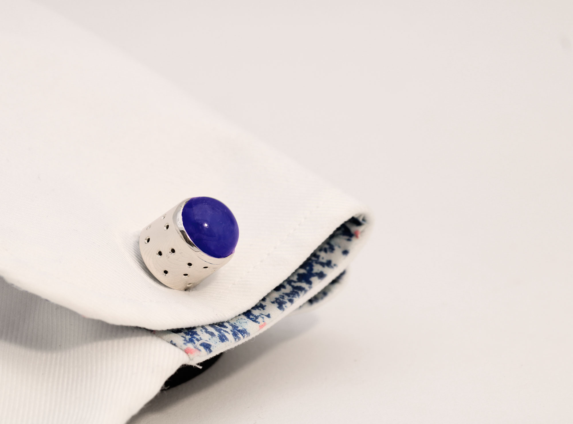 Silver cufflinks for man with amethyst. Combination of curves with holes that allow light to pass through, illuminating the cabochon-cut amethyst. The holes refer to the freedom of light traveling through the interior of the jewel .